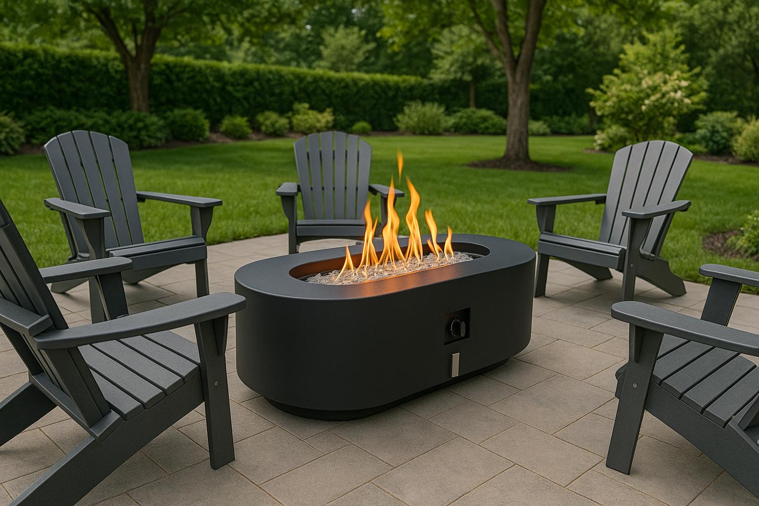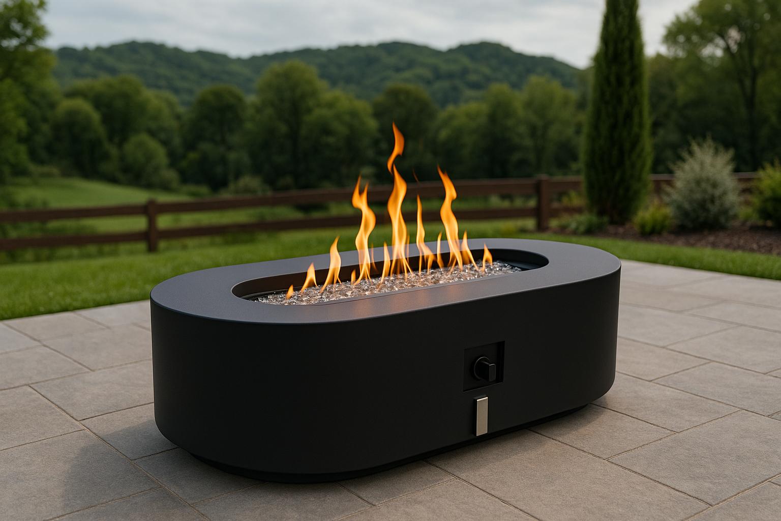 مدفأة خارجية مودرن (Modern Outdoor Fire Pit) بتصميم بيضاوي أنيق، وتُعد مزيجاً بين القطعة النحتية الفنية والأداة الوظيفية للتدفئة.