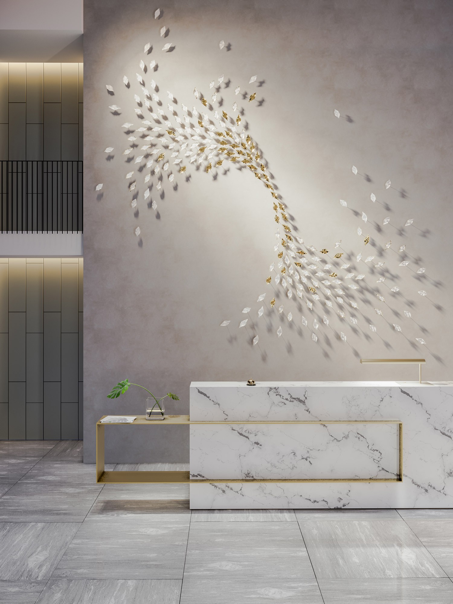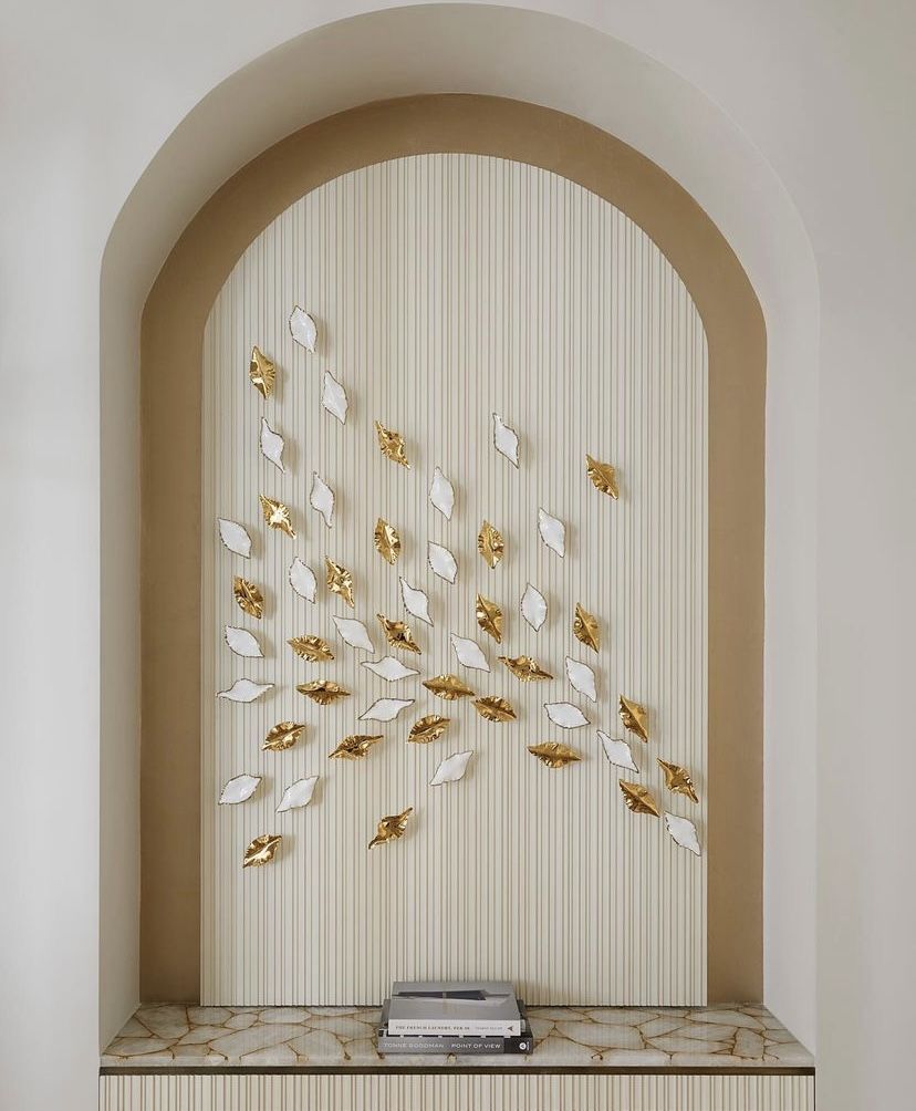 مادة ديكور فاخرة تُعرف بـ المنحوتات المعلقة أو جداريات "سرب الأوراق" (Artistic Leaf Installations)، وهي تُصنف ضمن "الديكورات المفاهيمية" (Conceptual Decor) التي تحول الفراغ من مجرد غرفة إلى صالة عرض فنية.